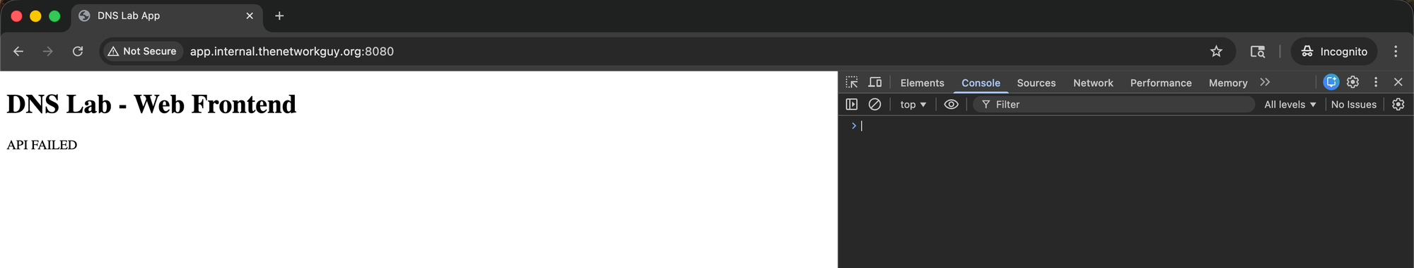 The reason: the application and its backend API use different hostnames. The application hostname resolves correctly. The API hostname does not.